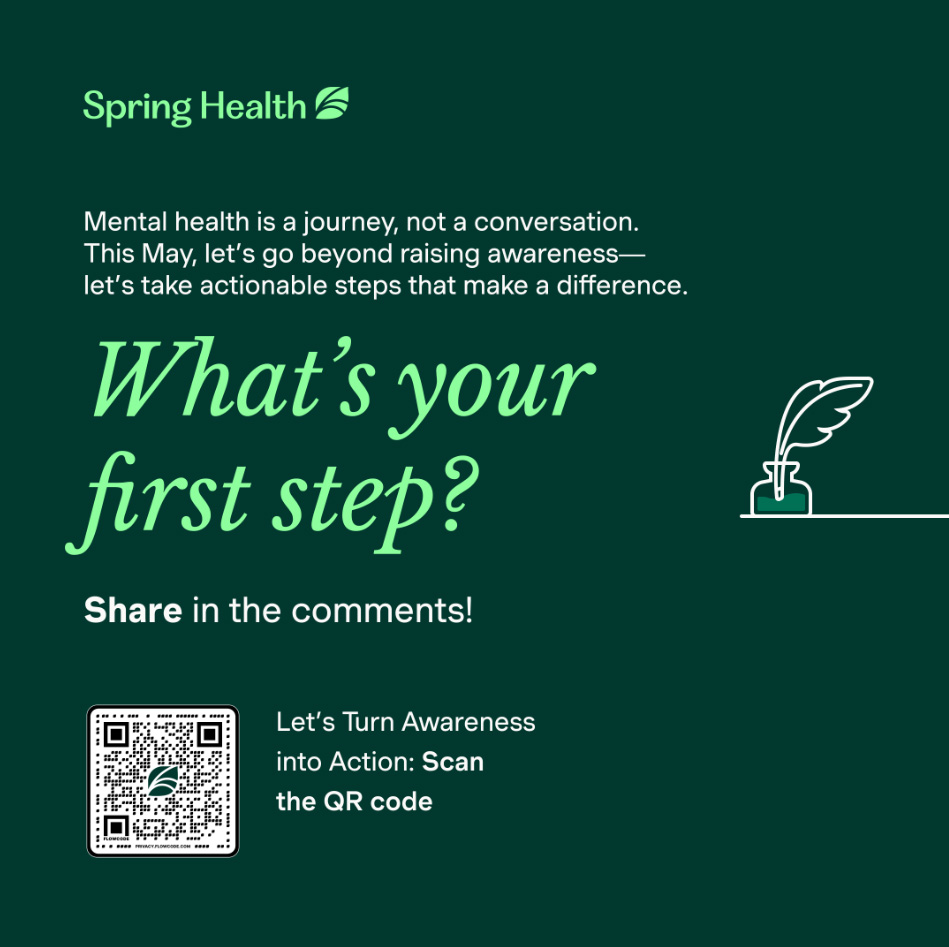 Through our mental health partner, Spring Health, help and treatments are available to all employees and their adult dependents (18+). Spring Health provides confidential, affordable, and dedicated support to help you on your path to recovery. Starting with a free consultation, Spring Health will connect you with a personalized care navigator who will help you find the right care options and providers.
